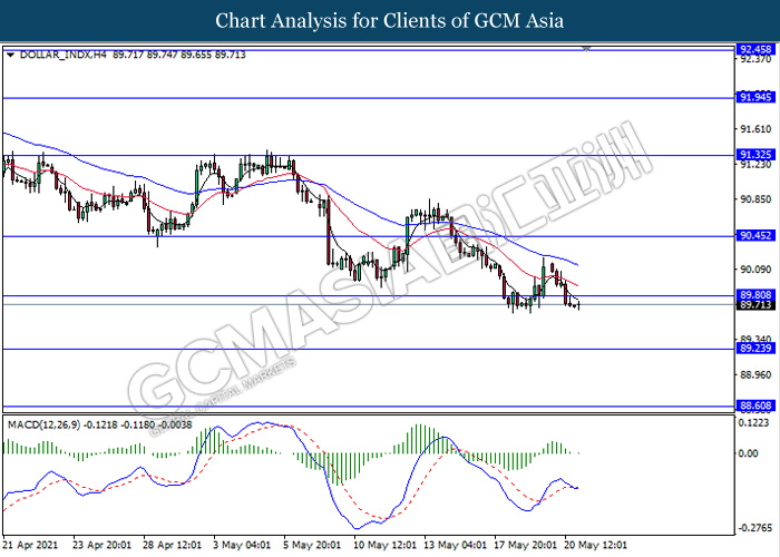 DOLLAR_INDX, H4: Indeks dolar telah didagang dengan lebih rendah susulan dengan pemecahan pada tahap sokongan sebelumnya 89.80. MACD yang memaparkan isyarat momentum bearish dengan formasi silang kematian mencadangkan dolar untuk melanjutkan kerugiannya ke arah tahap sokongan 89.25.