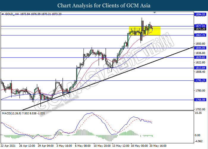 GOLD_, H4: Harga emas kekal didagang dalam saluran sisi susulan dengan pengunduran dari tahap rintangan 1877.00. MACD yang memaparkan isyarat momentum bearish mencadangkan komoditi ini untuk melanjutkan kerugiannya ke arah tahap sokongan 1863.25.