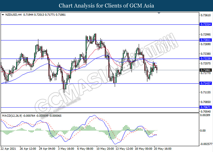 NZDUSD, H4: NZDUSD telah didagang dengan lebih rendah susulan dengan pengunduran dari paras tingginya. MACD yang memaparkan isyarat bias bearish mencadangkan pasangan ini untuk melanjutkan pengundurannya ke arah tahap sokongan 0.7145.