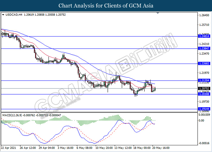 USDCAD, H4: USDCAD telah didagang dengan lebih rendah sementara ia sedang menguji tahap sokongan 1.2030. Namum, MACD yang memaparkan isyarat bias bullish mencadangkan pasangan ini untuk mengalami pembetulan teknikal ke arah tahap rintangan 1.2135.