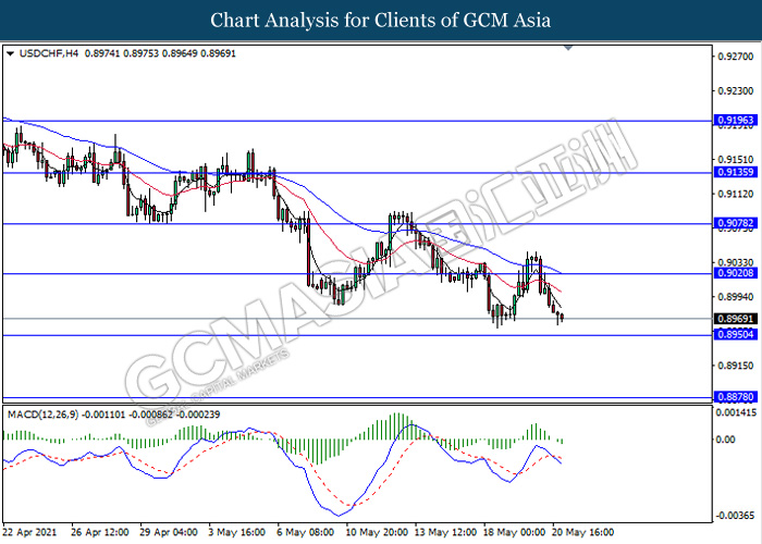 USDCHF, H4: USDCHF telah didagang dengan lebih rendah sementara ia sedang menguji berhampiran dengan tahap sokongan 0.8950. MACD yang memaparkan isyarat momentum bearish dengan formasi silang kematian mencadangkan pasangan ini untuk melanjutkan kerugiannya selepas ia memecah tahap sokongan tersebut.