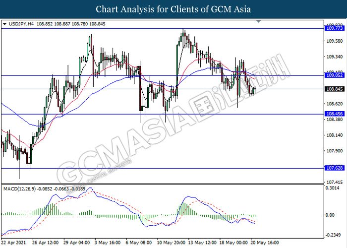 USDJPY, H4: USDJPY telah didagang dengan lebih rendah susulan dengan pemecahan pada tahap sokongan sebelumnya 109.05. MACD yang memaparkan isyarat momentum bearish mencadangkan pasangan ini untuk melanjutkan kerugiannya ke arah tahap sokongan 108.45.