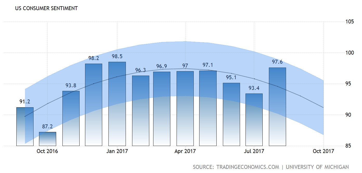 Sentimen para pengguna A.S. meningkat ke paras 97.6 berbanding dengan ramalan sebanyak 94.00 bagi bulan Ogos.