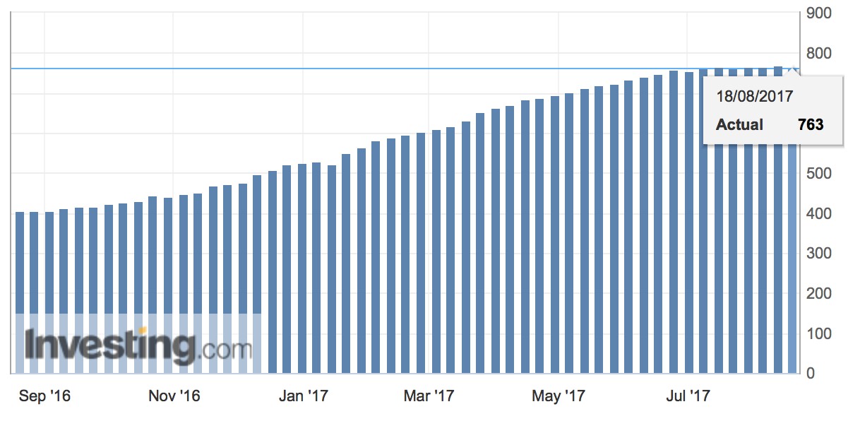 Bilangan pelantar minyak yang aktif di A.S. telah susut sebanyak 5 dan jumlah keseluruhan kini di paras 763.