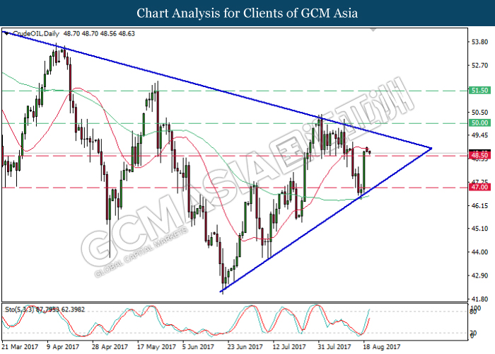 CrudeOIL, Daily: Harga minyak mentah kekal didagang di dalam segi tiga menyempit dan ia telah berundur dari garisan 20-MA (merah) baru-baru ini. Pergerakan harga tersebut mencadangkan harganya untuk didagang dengan lebih rendah pada jangka pendek dan menuju ke sasaran 48.50. Namun, arah aliran bagi jangka panjang hanya boleh dikenal pasti selepas ia memecah keluar dari salah satu sisi segi tiga tersebut.