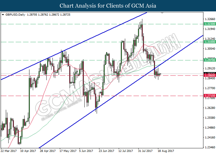 GBPUSD, Daily: GBPUSD telah memecah keluar dari paras bawah saluran menaik menyempit dan ia memberi isyarat kepada pertukaran arah aliran untuk menurun selanjutnya. Kedua-dua garisan MA yang masih menyempit ke bawah mencadangkan GBPUSD untuk meneruskan kerugiannya selepas ia memecahkan tahap sokongan 1.2860.