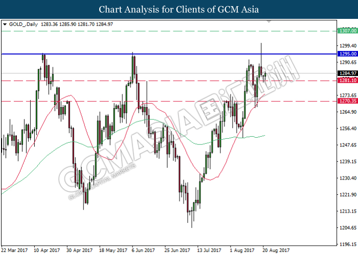 GOLD_, Daily: Harga emas telah didagang dengan lebih tinggi selepas ia melantun dari tahap sokongan yang kukuh iaitu 1281.10. Kedua-dua garisan MA yang masih melebarkan jarak dan menuju ke atas mencadangkan harga emas untuk meneruskan kenaikannya dan menuju ke tahap rintangan yang kukuh di 1295.00.