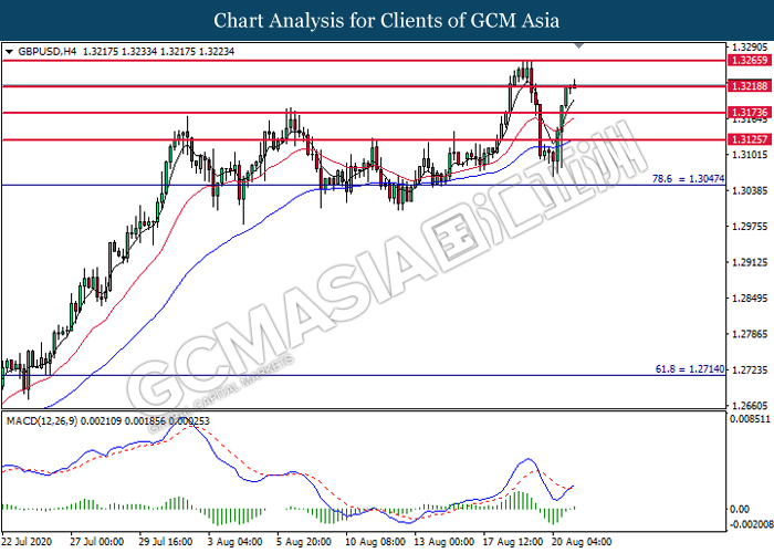 GBPUSD, H4: GBPUSD telah didagang dengan lebih tinggi sementara ia sedang menguji tahap rintangan di 1.3220. MACD yang memaparkan isyarat momentum bullish yang berterusan mencadangkan pasangan ini untuk didagang dengan lebih tinggi selepas ia memecah tahap rintangan tersebut.