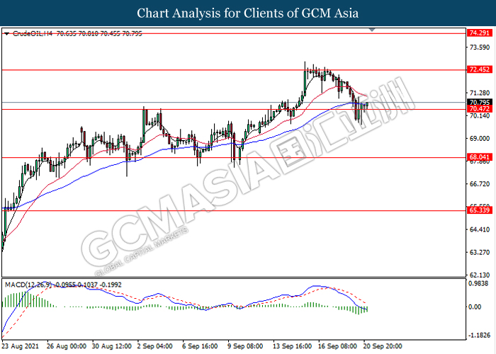 CrudeOIL, H4: Harga minyak mentah telah didagang dengan lebih tinggi susulan dengan lantunan dari tahap sokongan 70.45. MACD yang memaparkan isyarat momentum bearish yang berkurangan mencadangkan komoditi ini untuk melanjutkan lantunannya ke arah tahap rintangan 72.45.
