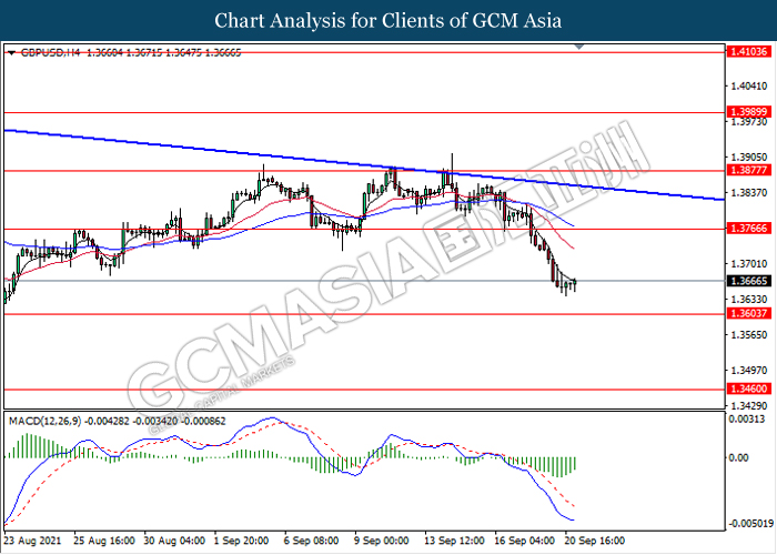 GBPUSD, H4: GBPUSD telah didagang dengan lebih rendah sementara ia sedang menguji berhampiran dengan tahap sokongan 1.3605. Namun, MACD yang memaparkan isyarat momentum bearish yang berkurangan mencadangkan pasangan ini untuk mengalami pembetulan teknikal ke arah tahap rintangan 1.3765.