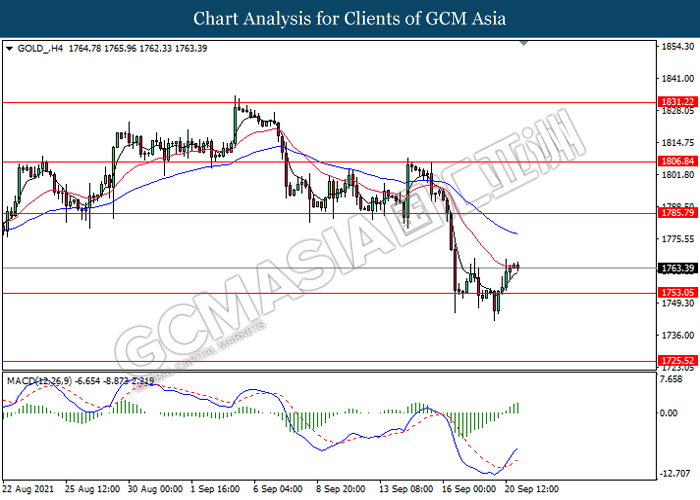 GOLD, H4: Harga emas telah didagang dengan lebih tinggi susulan dengan lantunan dari tahap sokongan 1753.50. MACD yang memaparkan isyarat momentum bullish dengan formasi silang emas mencadangkan komoditi ini untuk melanjutkan lantunannya ke arah tahap rintangan 1785.80.