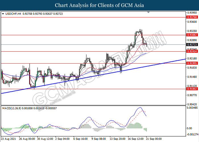 USDCHF, H4: USDCHF telah didagang dengan lebih rendah susulan dengan pengunduran dari tahap rintangan 0.9310. MACD yang memaparkan isyarat momentum bearish dengan formasi silang kematian mencadangkan komoditi ini untuk melanjutkan kerugiannya ke arah tahap sokongan 0.9245.