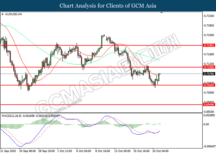 AUDUSD, H4: AUDUSD telah didagang dengan lebih tinggi selepas ia melantun dari tahap sokongan 0.7030. MACD yang memaparkan momentum bullish mencadangkan pasangan ini untuk melanjutkan keuntungannya ke arah tahap rintangan 0.7105.