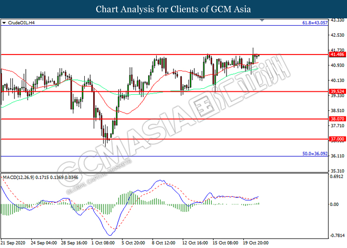 CrudeOIL, H4: Harga minyak mentah telah didagang dengan lebih tinggi sementara kini menguji di tahap rintangan 41.50. MACD yang memaparkan momentum bullish mencadangkan komoditi ini untuk melanjutkan keuntungannya selepas ia memecah tahap rintangan tersebut.