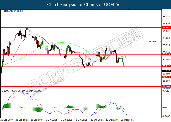 DOLLAR_INDX, H4: Indeks dolar telah didagang dengan lebih rendah selepas ia memecah tahap sokongan terdahulu 93.00. MACD yang memaparkan momentum bearish mencadangkan indeks tersebut untuk melanjutkan kerugiannya ke arah tahap sokongan 92.55.