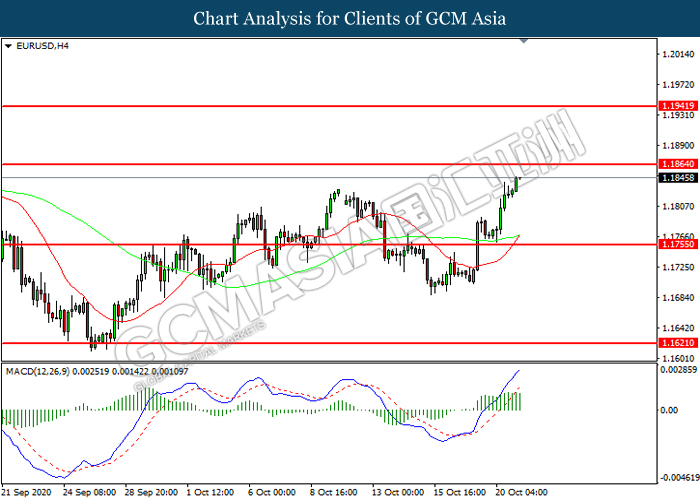 EURUSD, H4: EURUSD telah didagang dengan lebih tinggi sementara kini berhampiran dengan tahap rintangan 1.1865. Namun, MACD yang memaparkan momentum bullish yang berkurangan mencadangkan pasangan ini untuk mengalami pembetulan teknikal bagi jangka pendek.