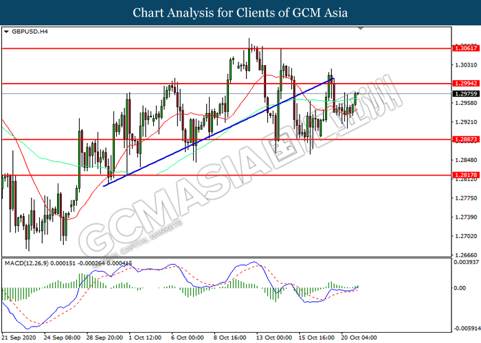 GBPUSD, H4: GBPUSD telah didagang dengan lebih tinggi selepas ia melantun dari tahap sokongan 1.2885. MACD yang memaparkan momentum bullish mencadangkan pasangan ini untuk melanjutkan keuntungannya ke arah tahap rintangan 1.2995.