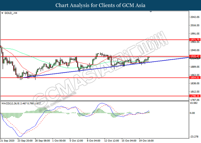 GOLD_, H4: Harga emas telah didagang dengan lebih tinggi sementara kini menguji di tahap rintangan 1920.45. MACD yang memaparkan momentum bullish mencadangkan komoditi ini untuk melanjutkan keuntungannya selepas ia memecah tahap rintangan tersebut.
