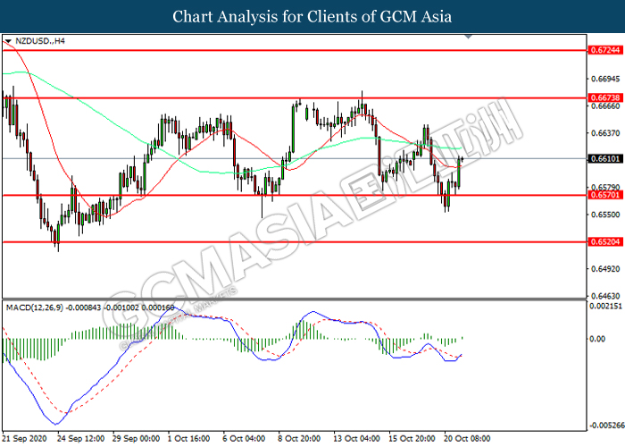 NZDUSD, H4: NZDUSD telah didagang dengan lebih tinggi selepas ia melantun dari tahap sokongan 0.6570. MACD yang memaparkan momentum bullish mencadangkan pasangan ini untuk melanjutkan keuntungannya ke arah tahap rintangan 0.6675.