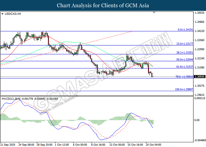 USDCAD, H4: USDCAD telah didagang dengan lebih rendah sementara kini menguji di tahap sokongan 1.3080. MACD yang memaparkan momentum bearish mencadangkan pasangan ini untuk melanjutkan kerugiannya selepas ia memecah tahap sokongan tersebut.