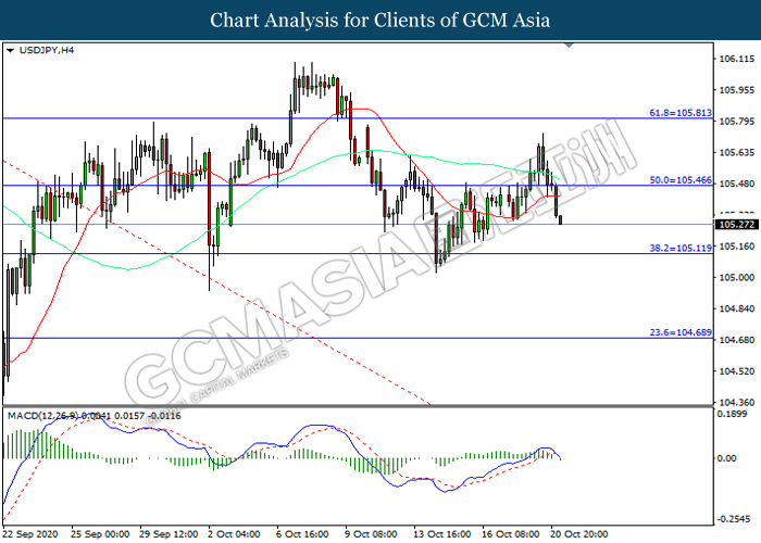 USDJPY, H4: USDJPY telah didagang dengan lebih rendah selepas ia memecah tahap sokongan terdahulu 105.45. MACD yang memaparkan momentum bearish mencadangkan pasangan ini untuk melanjutkan kerugiannya ke arah tahap sokongan 105.10.