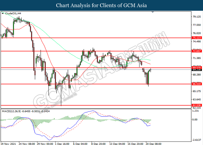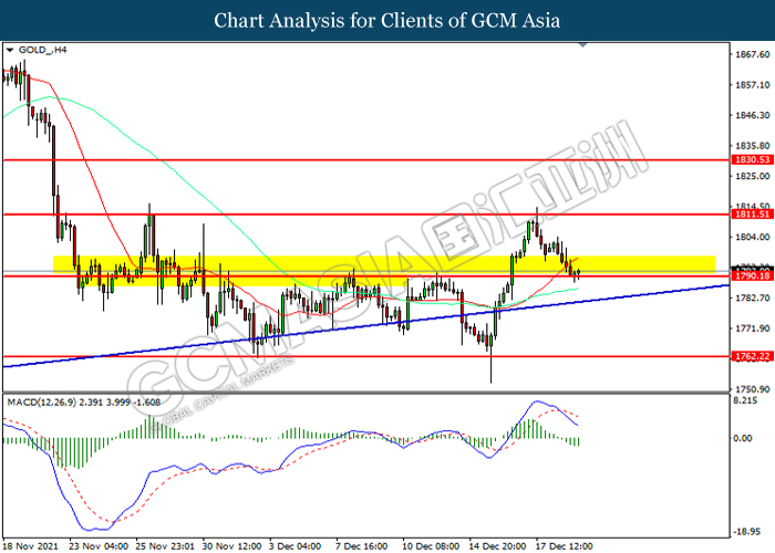 Bagi pasaran komoditi, harga minyak mentah telah melonjak sebanyak 0.23% ke $69.70 setong semasa penulisan di tengah-tengah pembetulan teknikal. Namun begitu, aliran keseluruhan bagi komoditi minyak mentah adalah masih kekal bearish di tengah-tengah peningkatan bilangan varian Omicron di seluruh dunia telah menjejaskan daya tarikan untuk komoditi hitam tersebut. Sebaliknya, harga emas telah menyusut sebanyak 0.04% ke $1790.20 se troy auns semasa penulisan susulan dengan para pelabur membuat spekulasi bahawa kemungkinan yang lebih tinggi untuk Rizab Persekutuan meningkatkan kadar faedahnya dalam asas jangka pendek.