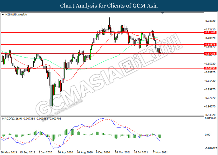 NZDUSD, Weekly: NZDUSD telah didagang dengan lebih rendah sementara kini menguji di tahap sokongan 0.6705. MACD yang memaparkan momentum bearish mencadangkan pasangan ini untuk melanjutkan kerugiannya selepas ia memecah tahap sokongan tersebut.