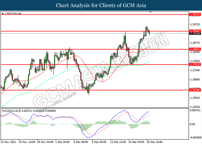 USDCAD, H4: USDCAD telah didagang dengan lebih tinggi sementara kini menguji di tahap rintangan 1.2935. Namun, MACD yang memaparkan momentum bullish yang berkurangan mencadangkan pasangan ini untuk mengalami pembetulan teknikal bagi jangka pendek.