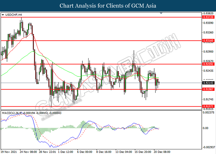 USDCHF, H4: USDCHF telah didagang dengan lebih rendah sementara kini menguji di tahap sokongan 0.9200. MACD yang memaparkan momentum bearish mencadangkan pasangan ini untuk melanjutkan kerugiannya selepas ia memecah tahap sokongan tersebut.