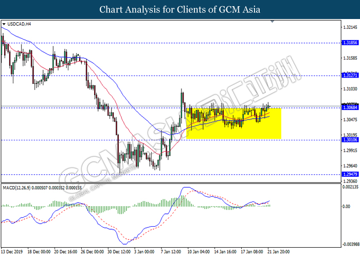 USDCAD, H4: USDCAD kekal didagang dalam saluran sisi sementara ia sedang menguji tahap rintangan 1.3070. MACD yang memaparkan isyarat momentum bullish dengan formasi silang emas mencadangkan pasangan ini untuk didagang dengan lebih tinggi selepas ia memecah tahap rintangan tersebut.