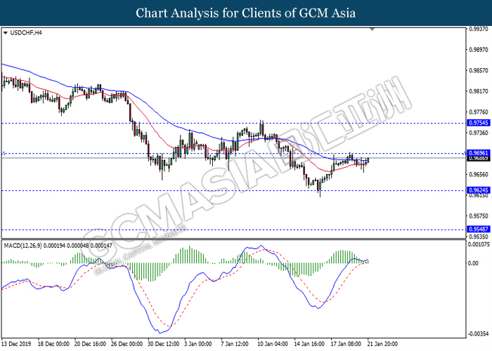 USDCHF, H4: USDCHF telah didagang dengan lebih tinggi sementara ia sedang menguji berhampiran dengan tahap rintangan 0.9695. MACD yang memaparkan isyarat momentum bullish mencadangkan pasangan ini untuk melanjutkan keuntungannya selepas ia memecah tahap rintangan tersebut.