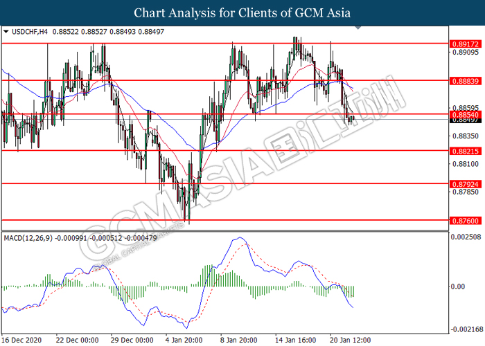 USDCHF, H4: USDCHF telah didagang dengan lebih rendah selepas ia memecah tahap sokongan sebelumnya di 0.8855. MACD yang memaparkan momentum bearish yang berterusan mencadangkan pasangan ini untuk melanjutkan kerugiannya dan menuju ke arah tahap sokongan di 0.8820.