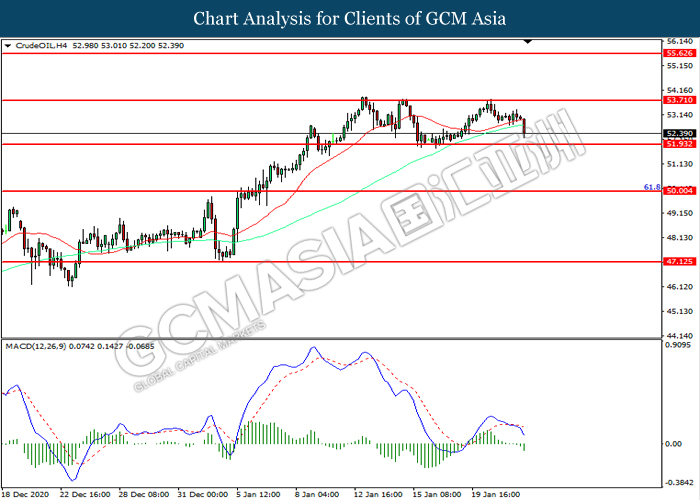 CrudeOIL, H4: Harga minyak mentah telah didagang dengan lebih rendah selepas ia berundur dari tahap rintangan 53.70. MACD yang memaparkan momentum bearish mencadangkan komoditi ini untuk melanjutkan kerugiannya ke arah tahap sokongan 51.95.