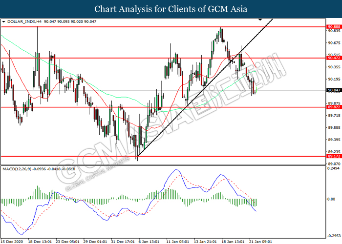 DOLLAR_INDX, H4: Indeks dolar telah didagang dengan lebih rendah selepas ia berundur dari tahap rintangan 90.45. MACD yang memaparkan momentum bearish mencadangkan indeks tersebut untuk melanjutkan kerugiannya ke arah tahap sokongan 89.80.