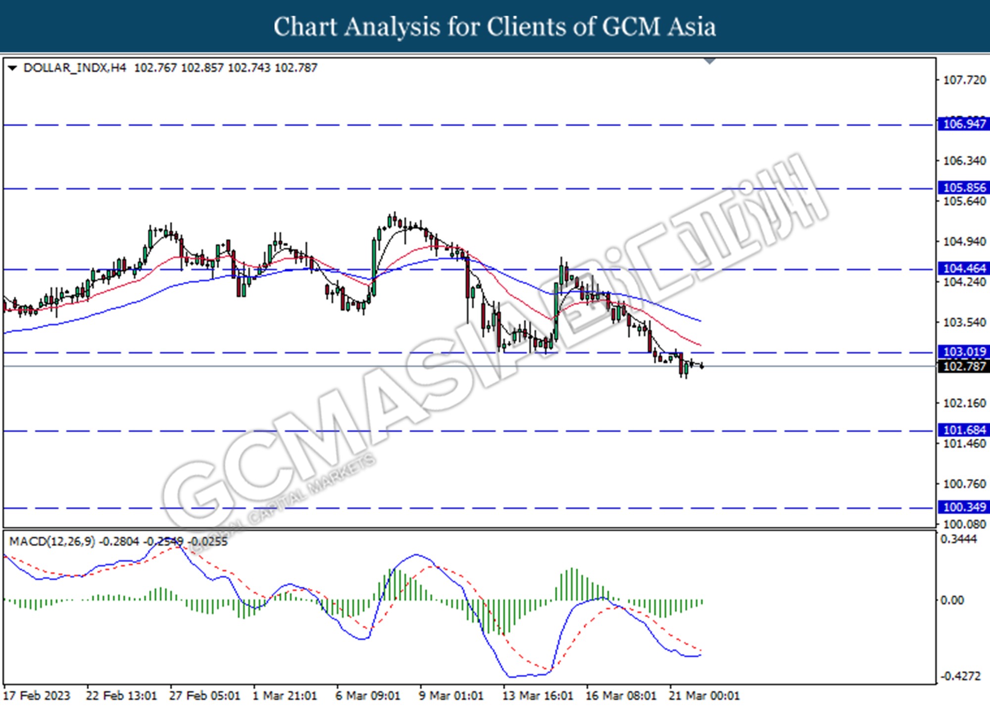 DOLLAR_INDX, H4: Indeks dolar telah didagang dengan lebih rendah selepas ia memecah tahap sokongan sebelumnya di 103.00. Namun, MACD yang menunjukkan isyarat momentum bearish yang berkurangan mencadangkan indeks ini untuk didagang dengan lebih tinggi sebagai pembetulan teknikal.