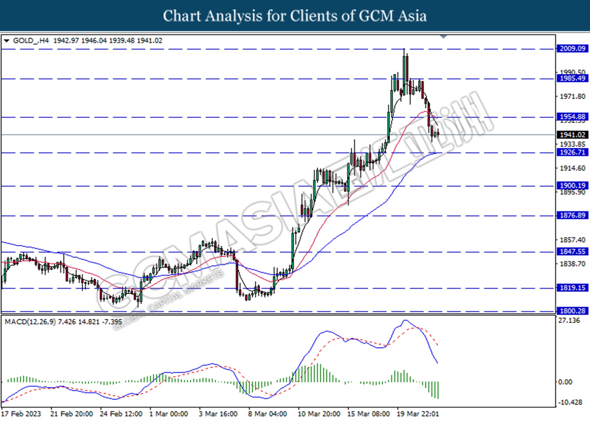 GOLD_, H4: Harga emas telah didagang dengan lebih rendah selepas ia memecah tahap sokongan sebelumnya di 1954.90. MACD yang menunjukkan isyarat momentum bearish yang berkurangan mencadangkan komoditi ini untuk melanjutkan kerugiannya dan menuju ke tahap sokongan di 1926.70.