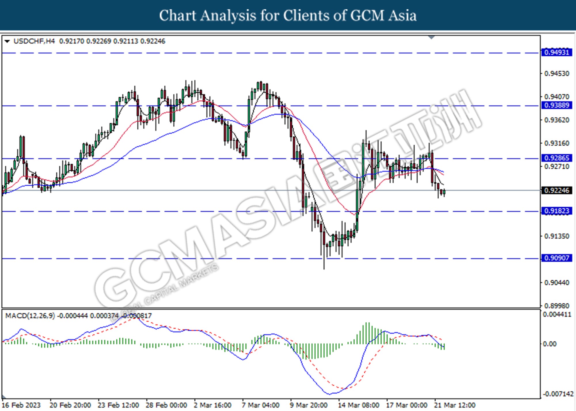 USDCHF, H4: USDCHF telah didagang dengan lebih rendah selepas ia memecah tahap sokongan sebelumnya di 0.9285. MACD yang memaparkan momentum bearish mencadangkan pasangan ini untuk melanjutkan kerugiannya dan menuju ke tahap sokongan di 0.9180.