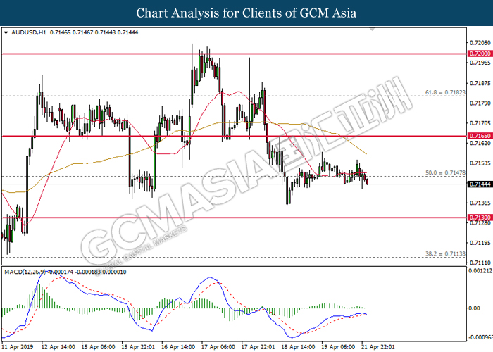 AUDUSD, H1: AUDUSD telah didagang dengan lebih rendah selepas ia menutup niaga di bawah tahap 0.7150. MACD yang memaparkan penyusutan pada momentum menaik mencadangkan pasangan ini untuk meneruskan kerugiannya dan menuju ke arah 0.7130.
