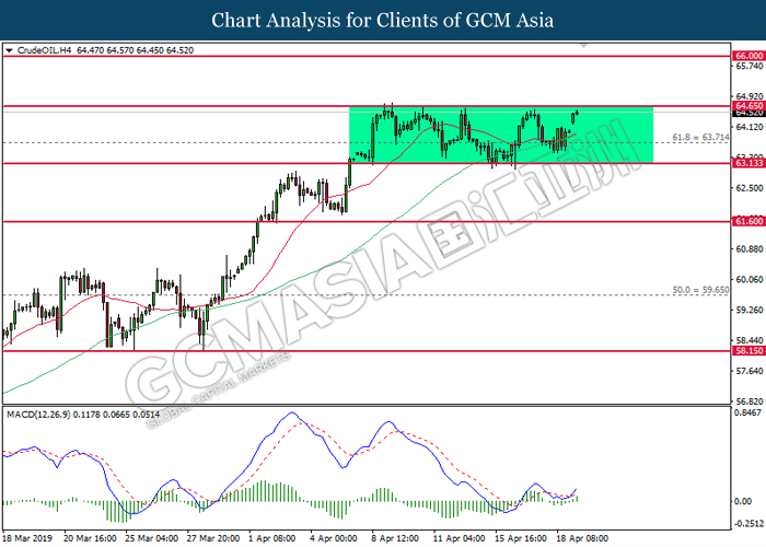 Bagi pasaran komoditi, harga minyak mentah meningkat sebanyak 0.50% ke $64.28 setong. Harga minyak masih kekal disokong oleh sentimen bullish susulan dengan penurunan pada pembekalan minyak di Arab Saudi dan inventori minyak di AS. Selain itu, harga emas meningkat sebanyak 0.07% ke $1,276.51 se troy auns berikutan dengan dolar yang lebih lemah.
