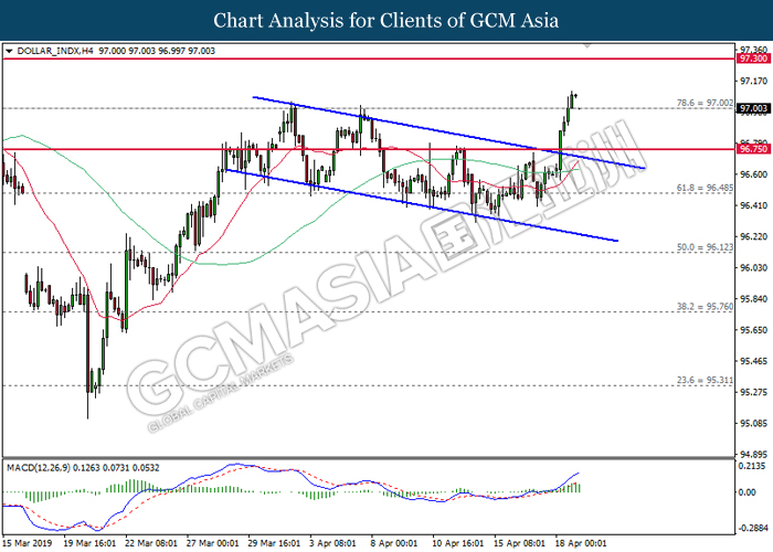 DOLLAR_INDX, H4: Indeks dolar telah dibuka dengan lebih rendah sementara kini menguji di tahap sokongan 97.00. MACD yang memaparkan penyusutan pada momentum menaik mencadangkan harganya untuk didagang dengan lebih rendah bagi jangka pendek sebagai pembetulan teknikal.