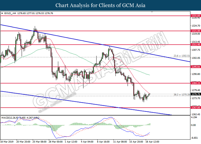 GOLD_, H4: Harga emas telah didagang dengan lebih tinggi selepas ia melantun dari tahap sokongan 1275.30. MACD yang memaparkan isyarat bullish mencadangkan harganya untuk meningkat selanjutnya bagi jangka pendek sebagai pembetulan teknikal.