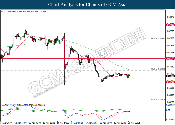 NZDUSD, H1: NZDUSD telah didagang secara rata di dalam lingkungan 0.6695 dan 0.6670. Namun, MACD yang memaparkan penyusutan pada momentum menaik mencadangkan pasangan ini untuk melanjutkan kerugiannya bagi jangka pendek dan menuju ke arah 0.6670.