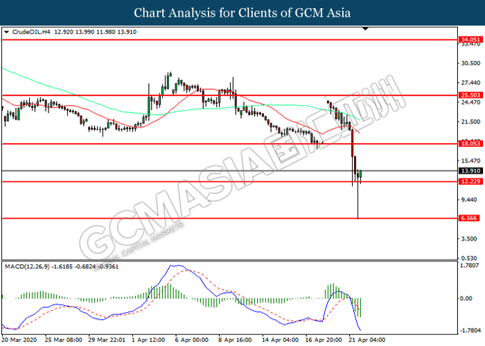 Bagi pasaran komoditi, harga minyak mentah telah meningkat sebanyak 2.22% ke $13.34 se tong. Namun, pasaran minyak mentah telah mencatat kerugiannya semalam selepas A.S melaporkan bahawa simpanan minyak mentah di Cushing sudah mencapai 70% penuh pada pertengahan April. Walau bagaimanapun, Arab Saudi dan Rusia menegaskan pada pagi ini bahawa mereka bersedia untuk mengambil langkah tambahan untuk menstabilkan pasaran minyak mentah dengan pengeluar lain. Sebaliknya, harga emas telah mencatat kerugiannya sebanyak 0.03% ke $1685.55 se troy auns susulan dengan kekukuhan dalam Dolar AS.