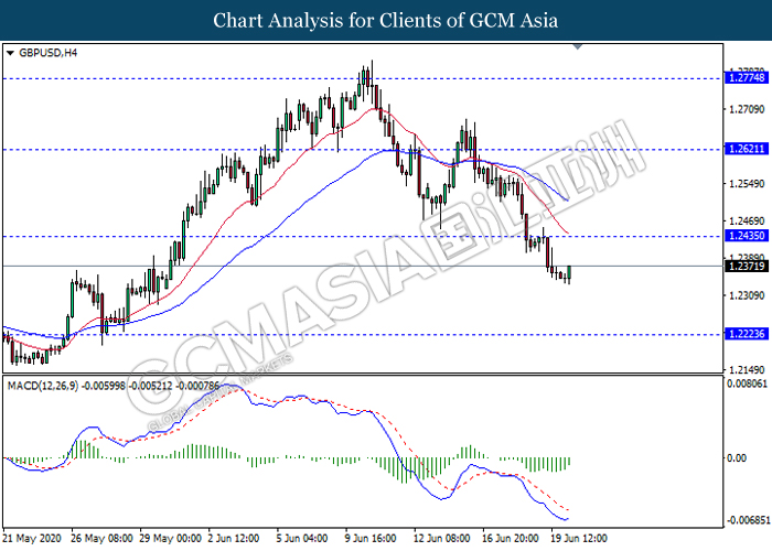 GBPUSD, H4: GBPUSD telah didagang dengan lebih rendah susulan dengan pemecahan pada tahap sokongan sebelumnya 1.2435. Namun, MACD yang memaparkan isyarat momentum bearish yang telah berkurangan mencadangkan pasangan ini untuk mengalami pembetulan teknikal jangka pendek ke arah tahap rintangan 1.2435.