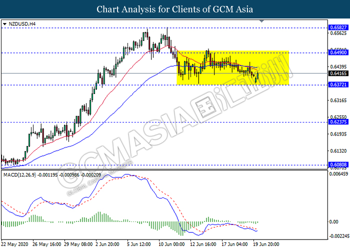 NZDUSD, H4: NZDUSD kekal didagang dalam saluran sisi susulan dengan lantunan dari tahap sokongan 0.6370. MACD yang memaparkan isyarat momentum bearish mencadangkan pasangan ini untuk melanjutkan lantunannya dalam jangka pendek ke arah tahap rintangan 0.6490.
