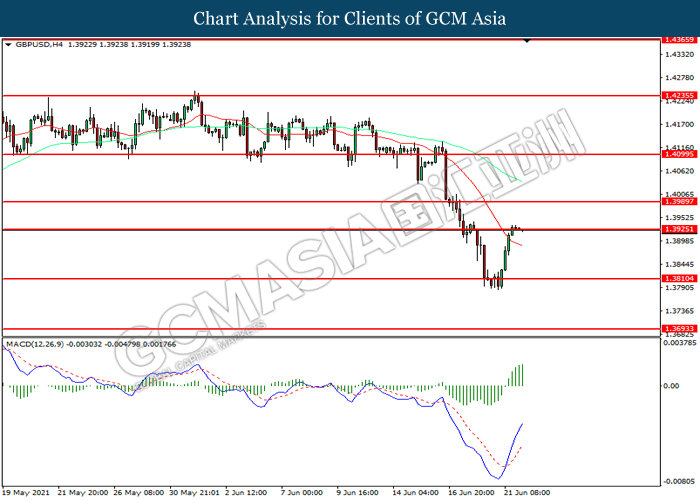 GBPUSD, H4: GBPUSD telah didagang dengan lebih tinggi sementara kini menguji di tahap rintangan 1.3925. MACD yang memaparkan momentum bullish mencadangkan pasangan ini untuk melanjutkan keuntungannya selepas ia memecah tahap rintangan tersebut.