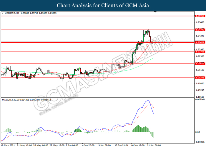 USDCAD, H4: USDCAD telah didagang dengan lebih rendah sementara kini menguji di tahap sokongan 1.2360. MACD yang memaparkan momentum bearish mencadangkan pasangan ini untuk melanjutkan kerugiannya selepas ia memecah tahap sokongan tersebut.