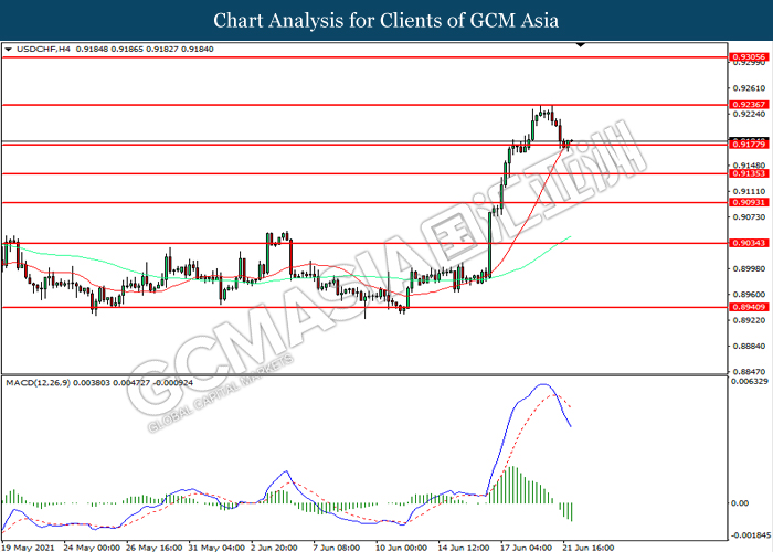 USDCHF, H4: USDCHF telah didagang dengan lebih rendah sementara kini menguji di tahap sokongan 0.9180. MACD yang memaparkan momentum bearish mencadangkan pasangan ini untuk melanjutkan kerugiannnya selepas ia memecah tahap sokongan tersebut.