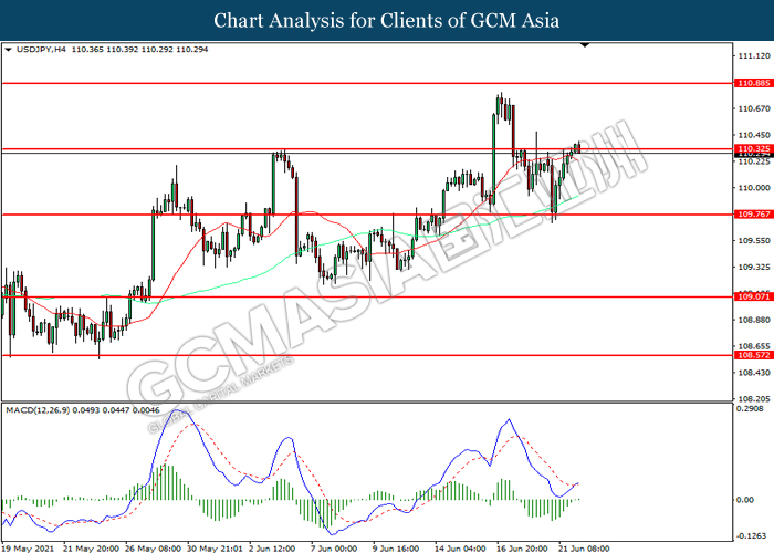 USDJPY, H4: USDJPY telah didagang dengan lebih tinggi sementara kini menguji di tahap rintangan 110.30. MACD yang memaparkan momentum bearish yang berkurangan mencadangkan pasangan ini untuk melanjutkan keuntungannya selepas ia memecah tahap rintangan tersebut.