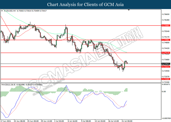 AUDUSD, H4: AUDUSD telah didagang dengan lebih tinggi selepas ia melantun dari tahap sokongan 0.7320. MACD yang memaparkan momentum bullish mencadangkan pasangan ini untuk melanjutkan keuntungannya ke arah tahap rintangan 0.7410.